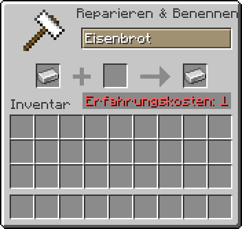 - Die Umbenennung eines beliebigen Gegenstandes, auch normaler Blöcke. Bei Platzierung in der Welt verlieren sie jedoch wieder diesen Namen (Eimer und Flasche bei Benutzung).