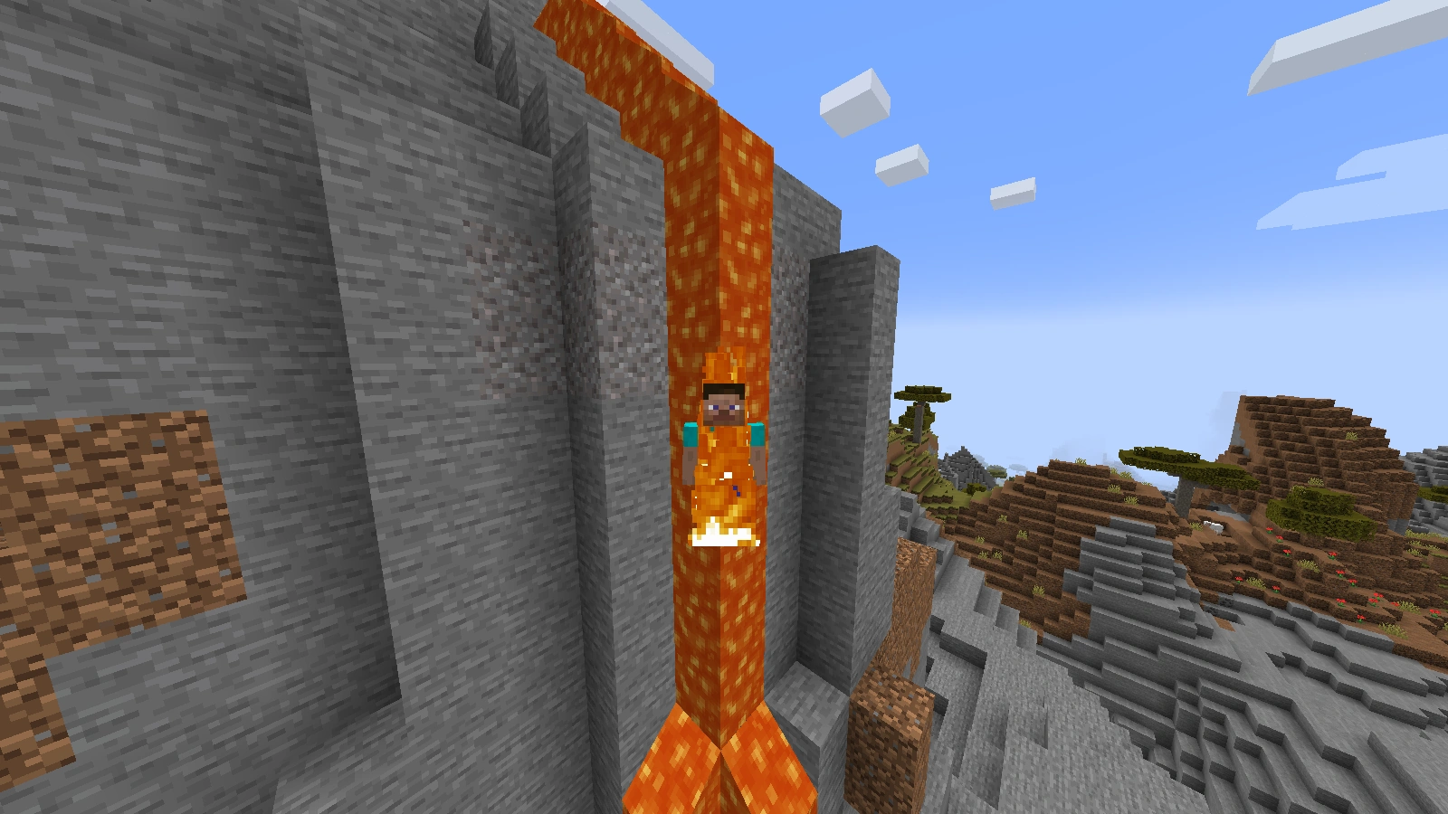 Lavafälle kann man mit Feuerschutz hinaufschwimmen, wobei man zwar nicht ertrinken, aber ebenfalls aus dem Strahl herausfallen kann.