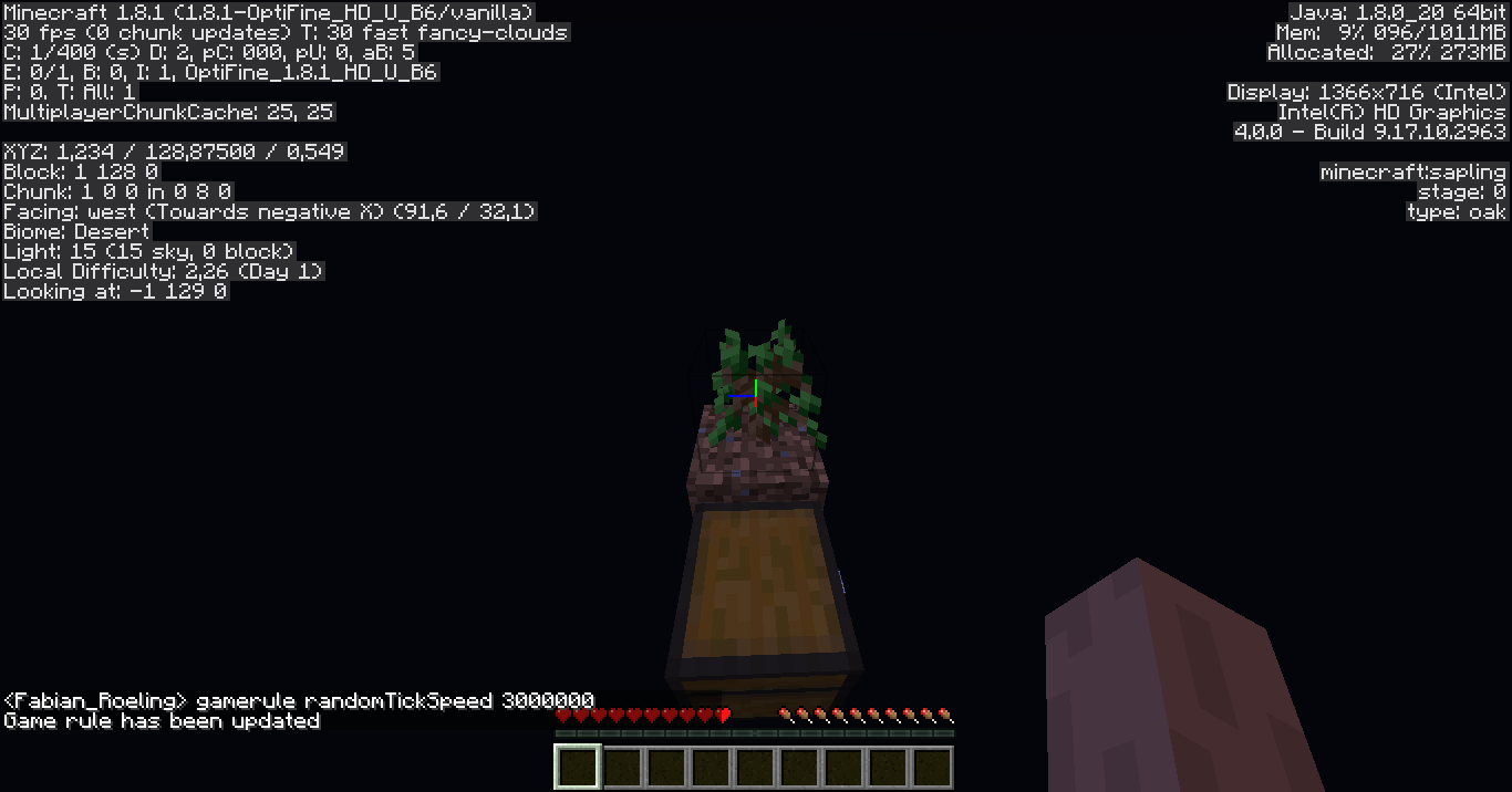 25 KB | Trotz /gamerule randomTickSpeed 3000000 bekommt der Setzling keinen Tick. |