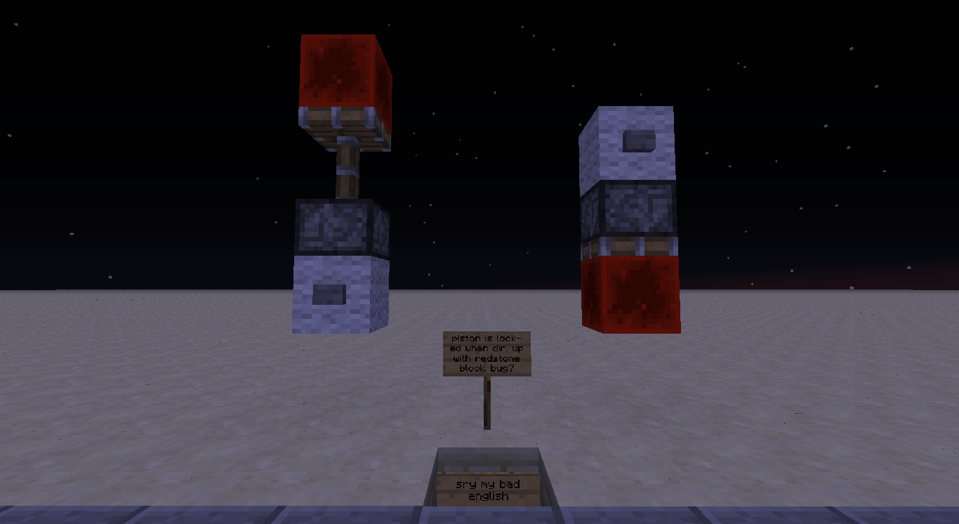 76 KB | Wenn man einen Piston nach oben platziert und darauf einen Redstoneblock, lässt sich der Piston ausfahren, aber bleibt dann in dieser Stellung. die anderen Richtungen laufen tadellos Ist kein BUD-switch. Und egal ob sticky oder nicht. Getestet mit Kabel, |
