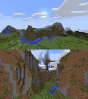 Die gleiche Welt (Seed "minecraft-de.gamepedia.com") oben als Standard-Welt und unten als Zerklüftet. Die Kamera befindet sich bei -41.5,96.0,290.5 mit der Rotation -90.0,0.0. -