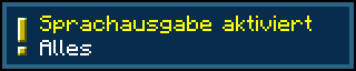 Die Sprachausgabe kann in den Chateinstellungen oder durch Strg + B aktiviert werden und kann Chat- und Systemnachrichten vorlesen. In den Minecraft-Optionen lässt sich einstellen, ob alle Nachrichten, nur Chatnachrichten oder nur Systemnachrichten vorgelesen werden sollen. Die entsprechende Meldung erscheint als Toast.