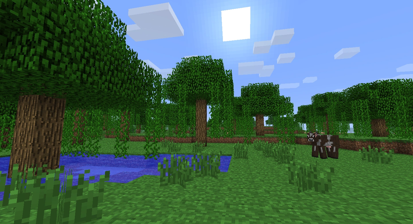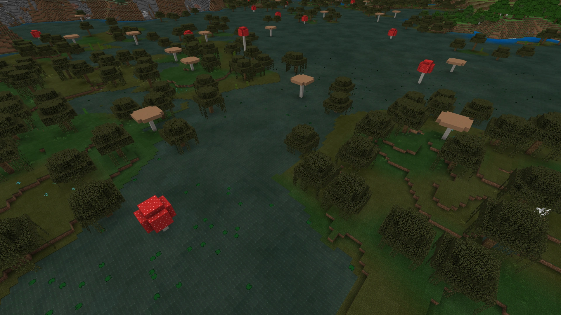 Der Sumpf ist ein flaches Biom am Übergang zwischen einem Gewässer und festem Land, an dessen Bäumen Ranken wachsen. Der Beginn des Sumpfgebietes ist am dunklen bzw. grünlich gefärbten Wasser und an den dunkelfeucht gefärbten Grasblöcken zu erkennen. Auch das hohe Gras, das Laub und die Ranken sind dunkler gefärbt.