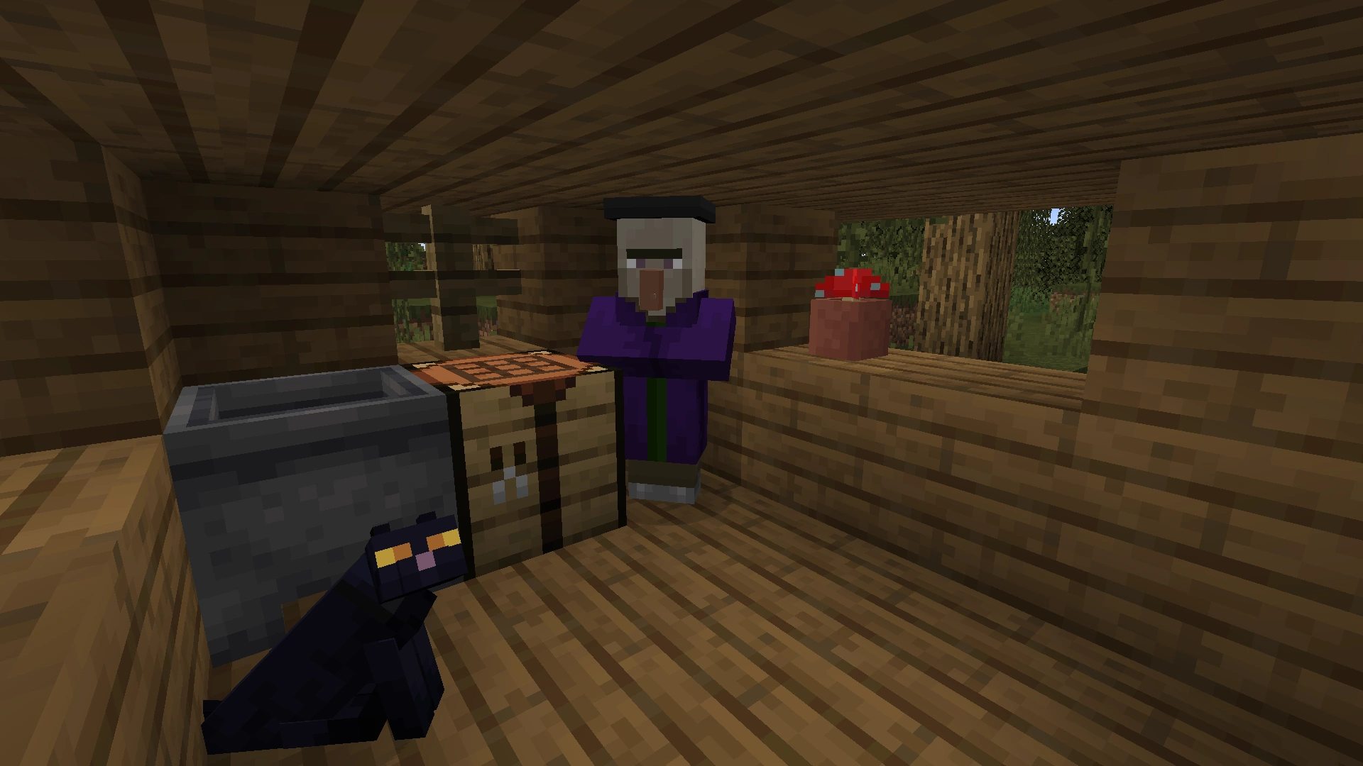 Sie bestehen aus Fichtenholzbrettern, Fichtenholztreppen, Zäunen, Holz, einer Werkbank und einem Kessel, einem Pilz, der sich in einem Blumentopf befindet, sowie mehreren Pilzen auf dem Boden.