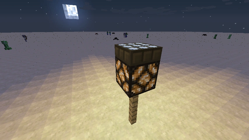 Oder man schließt einen Befehlsblock an, um zu einer bestimmten Uhrzeit einen Befehl auszuführen. Man könnte z.B. bei Beginn der Nacht die Zeit auf den nächsten Tag setzen, um die Nacht zu überspringen. Wenn die Bewegung der Sonne nicht wichtig ist, ist es allerdings einfacher, einmalig (ohne Befehlsblock) den Befehl /gamerule doDaylightCycle false aufzurufen, der den Lauf von Sonne (bzw. Mond) sofort anhält.