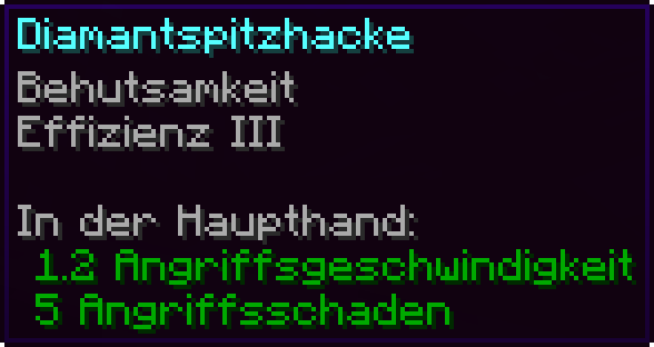 Erhöht die Abbaugeschwindigkeit unter Wasser | I | Das Abbauen von Blöcken unter Wasser geschieht mit normaler Geschwindigkeit. | |||||||||||||||||||||||||||||||||||