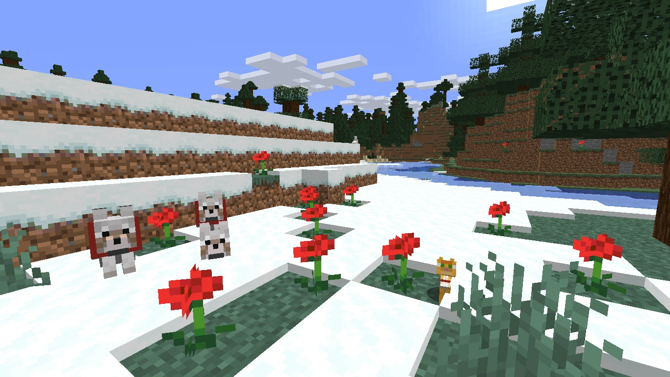 Eine Familie von Hunden in einem verschneiten Tundra-Biom sowie ein Kätzchen.