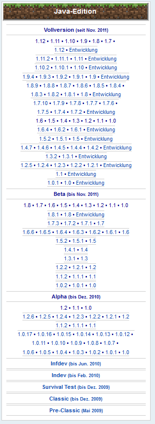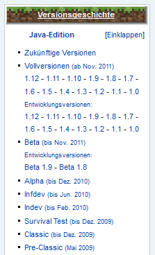 Naja, es ist halt ein Klick mehr. Obwohl ich finde, dass man den in Kauf nehmen kann, dafür, dass man nun zu jeder einzelnen Version direkt springen kann. Das fehlt nämlich noch gänzlich. Und die Snapshots direkt bei den Versionen einzugliedern finde ich nochmal ein ganzes Stück benutzerfreundlicher, anstatt sie einzeln aufzulisten. Da braucht man nicht an zwei Stellen zu suchen, sondern klickt bspw. auf die 1.11 und hat auch gleich alles, was zu 1.11 gehört (alle einzelnen Versionen und die Snapshots). Fusseel (Diskussion) 19:45, 22. Jun. 2017 (UTC)