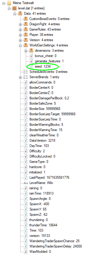 - Version: Optional. Enthält seit Vollversion 1.9 (15w32a) Informationen zu der Spiele-Version, in der die Welt zuletzt gespeichert wurde.