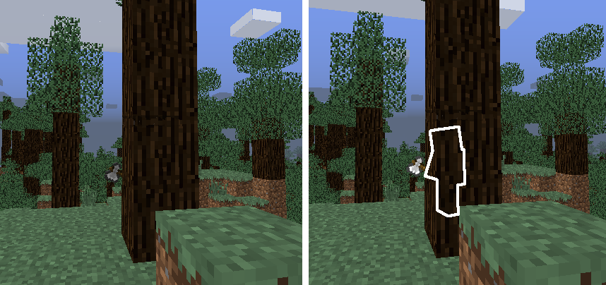 Transparente Blöcke sieht man auch, wenn sie komplett von anderen Blöcken umgeben sind. Dazu gehören neben Glas alle Blöcke, die nicht vollständig einen Block ausfüllen, also beispielsweise Kolben, Truhe, Lava, Wasser, Ackerboden, Trampelpfad.