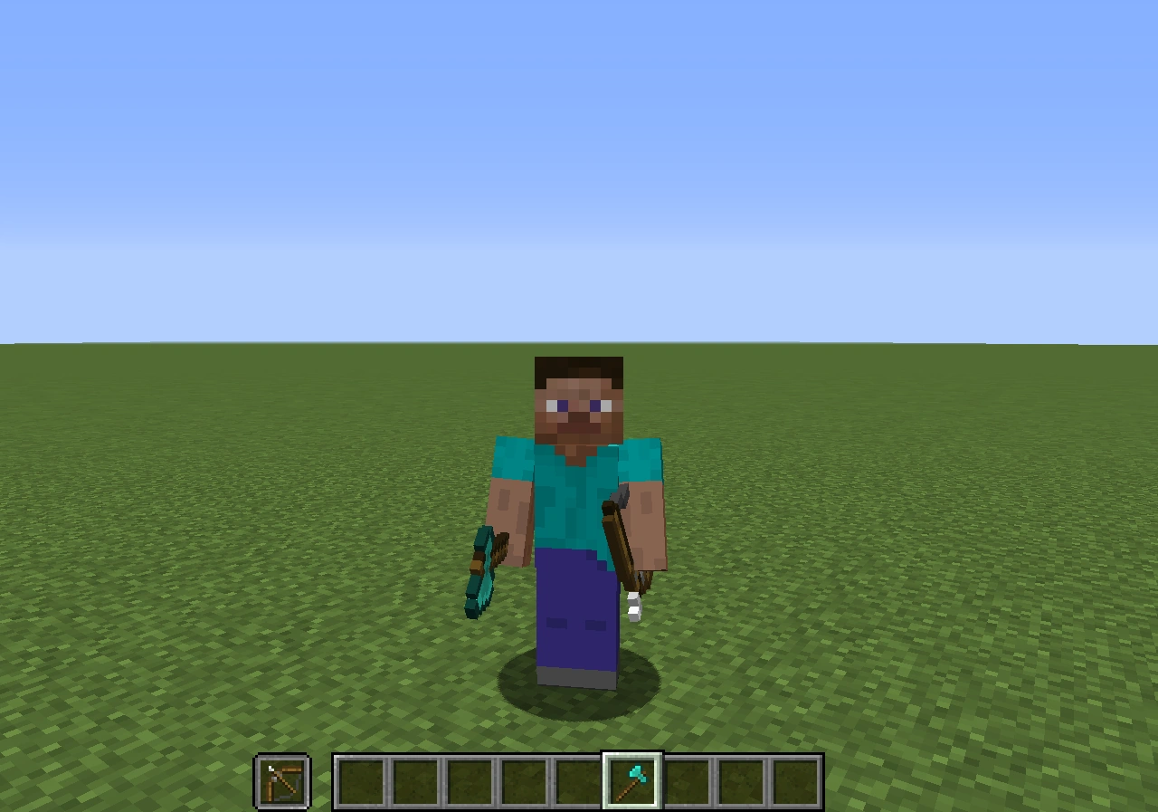 Es ist jedoch nicht möglich zwei Schwerter in beiden Händen auszurüsten, da nur die Haupthand zum Abbauen und Angreifen benutzt werden kann. Ausnahmen sind Objekte, die Schaden durch das Benutzen (Rechte Maustaste) machen, z.B. Bögen oder Tränke.