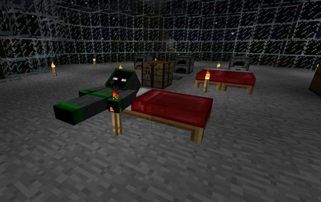 - La cama parece forzar la cámara para estar en la cama; mientras la pantalla desaparece, aún puedes moverte, romper/poner bloques, lanzar flechas, etc., pero no puedes ver donde estás o ver tus armas/herramientas. A esto se le llama “sleepwalking” (Sonámbulo).
