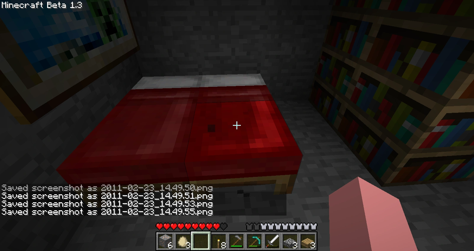 - Si hace click en la cama mientras mantiene un arco con flechas en su inventario, usted se quedará dormido y seria como si una copia invisible del jugador estuviese de pie donde estaba, las flechas se dispararán a partir de ese punto, caerán a través de la cama y se perderán para siempre. Las flechas no te dañarán.