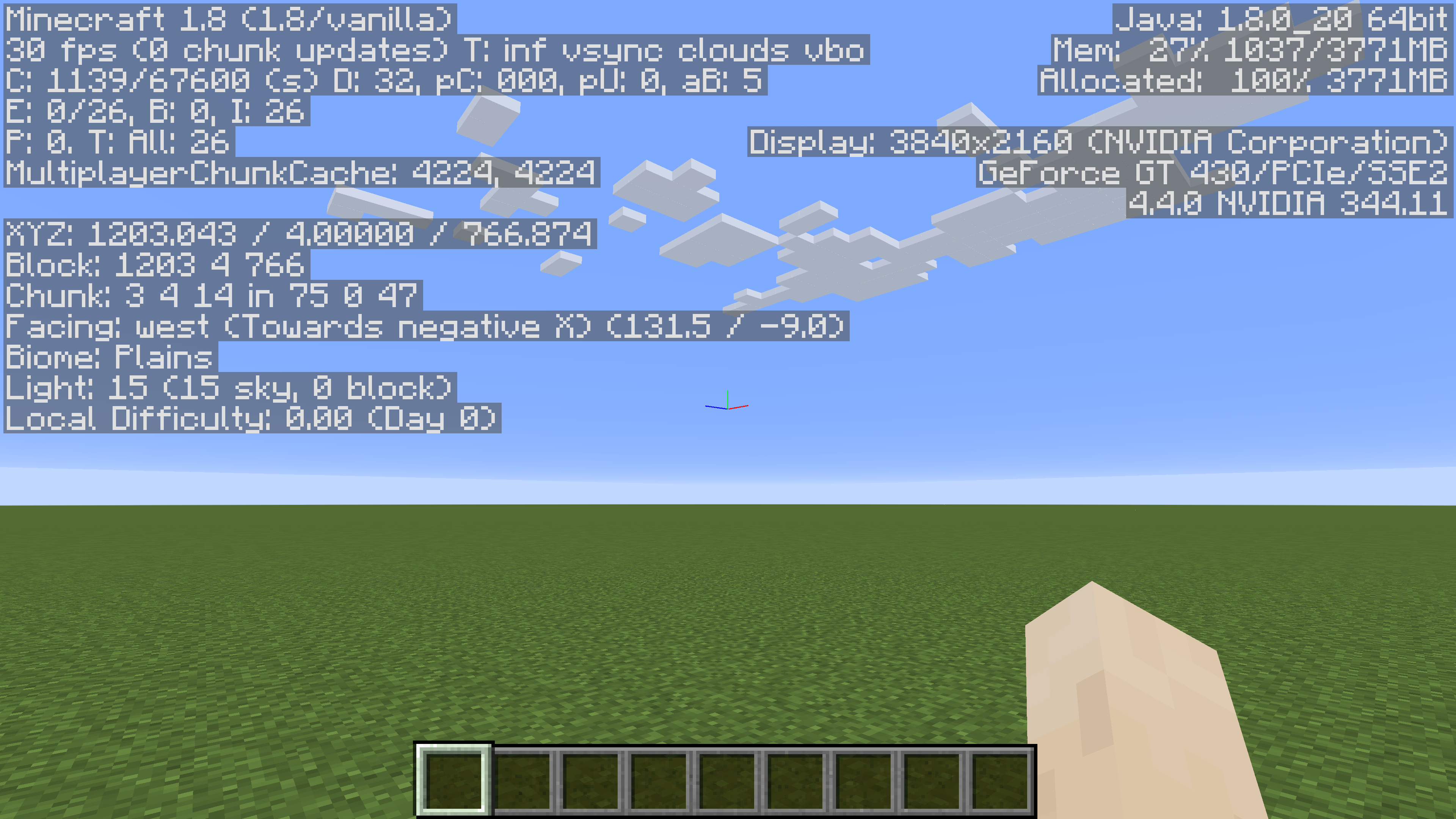 Captura enseñando la pantalla de información, con coordenadas XYZ y dirección a la que el jugador mira (f).