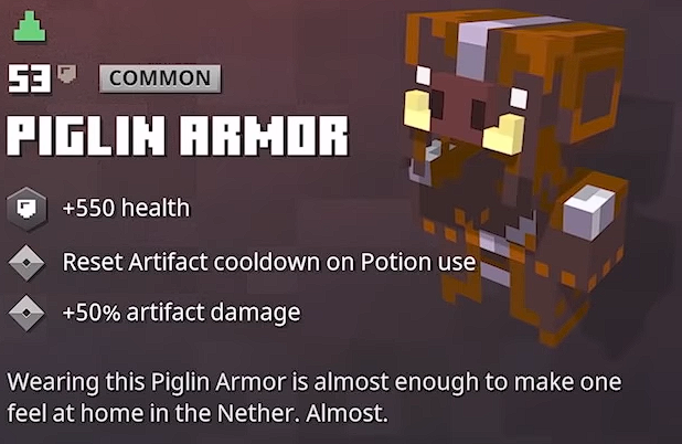 La Armadura de Piglin es un conjunto de armaduras que se puede encontrar dentro del Nether DLC de Minecraft Dungeons. Su variante única es la armadura de piglin dorada.