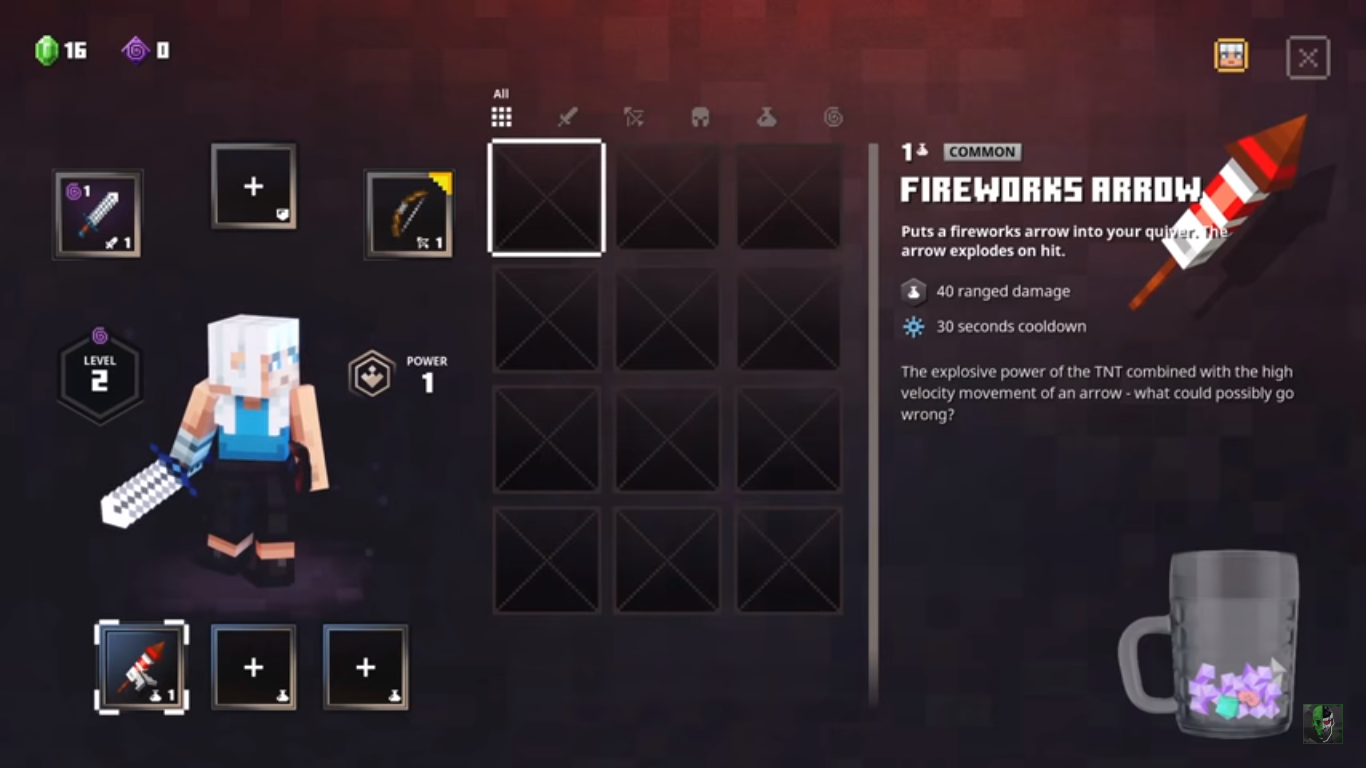 | June 9, 2019 | La flecha de fuegos artificiales revelada en el tráiler del juego Minecraft Dungeons. En este punto, tenía un ícono de inventario diferente. | ||||