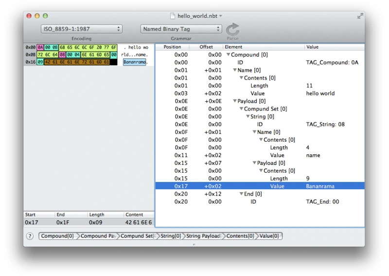 | NBT grammar for Synalyze It! | Plantilla:Tc | Usando esta gramática Synalyze It! muestra un volcado hexadecimal codificado por colores junto con el árbol de etiquetas analizadas. Actualmente solo se admiten archivos sin comprimir. |