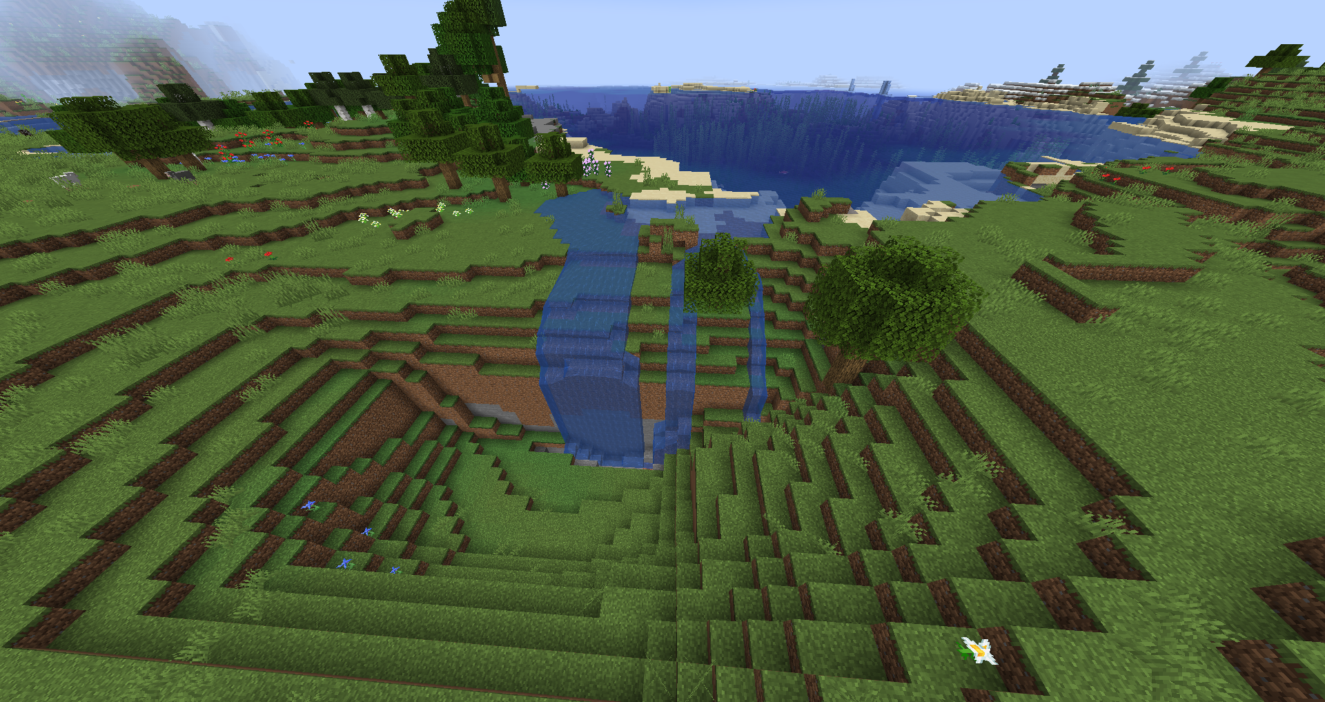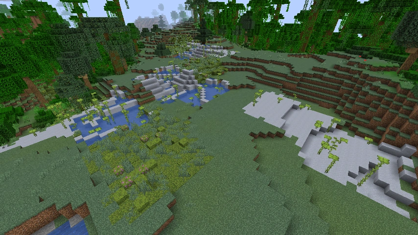 - Un bioma plano pero elevado que parece una llanura florida y más fría, con un color de césped aqua y un color de agua azul oscuro.