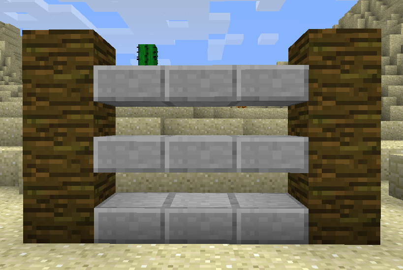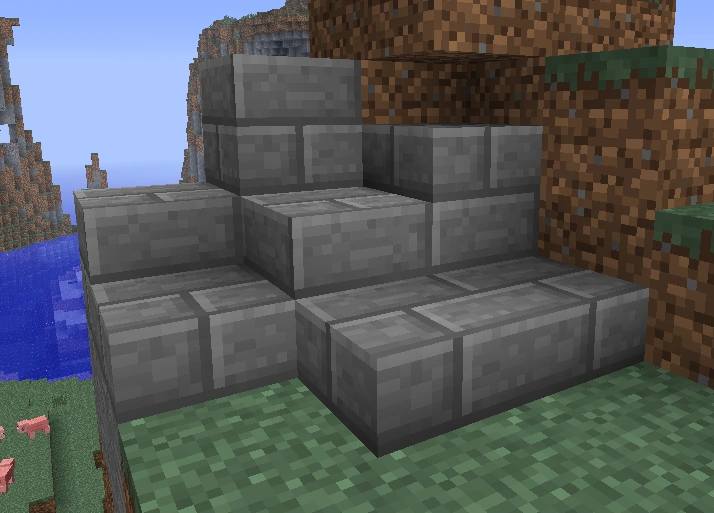 | Los bloques de losas de piedra se llamaban bloques de escaleras antes de que se añadieran las escaleras actuales; después de esto, se conocían como "pasos" (las dos formas eran "pasos simples" y "pasos dobles") antes de que todos los elementos obtuvieran nombres oficiales en el lanzamiento de la Beta. | |||||