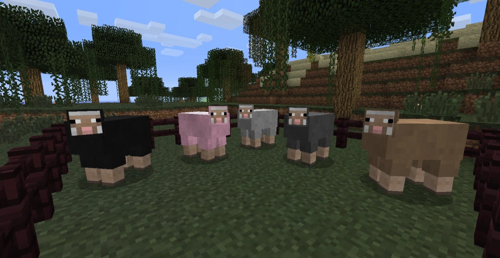 Los tintes pueden aplicarse directamente a las ovejas siempre que tengan lana, haciendo que den bloques de lana de su respectivo color teñido. Cuando dos ovejas de dos colores distintos tengan una cría, esta será mezcla de sus padres (una oveja blanca y otra roja darán a luz a una rosa). Cuando esto no sea posible por no haber un color intermedio, la oveja resultante será de uno de los colores de sus padres, habiendo un 50% de probabilidad de cada uno.