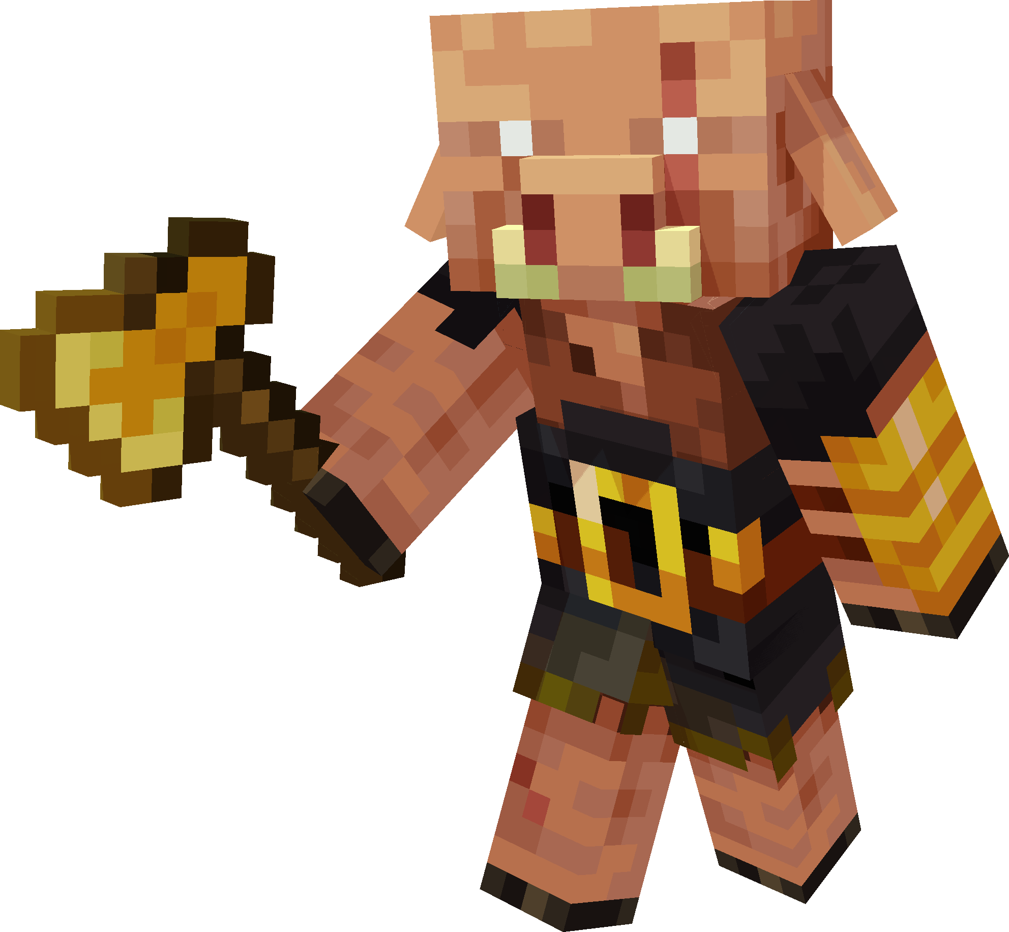 - Un piglin bruto tiene un 8,5% de probabilidad de dejar caer una hacha de oro con una durabilidad aleatoria si es asesinado por un jugador o un lobo domesticado, aumenta en un 1% con cada nivel de Saqueo, con una probabilidad total de 11.5% con Saqueo III.