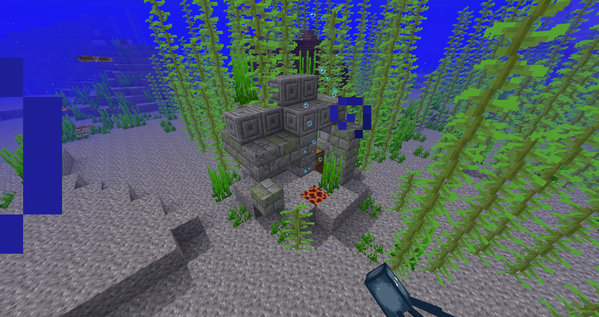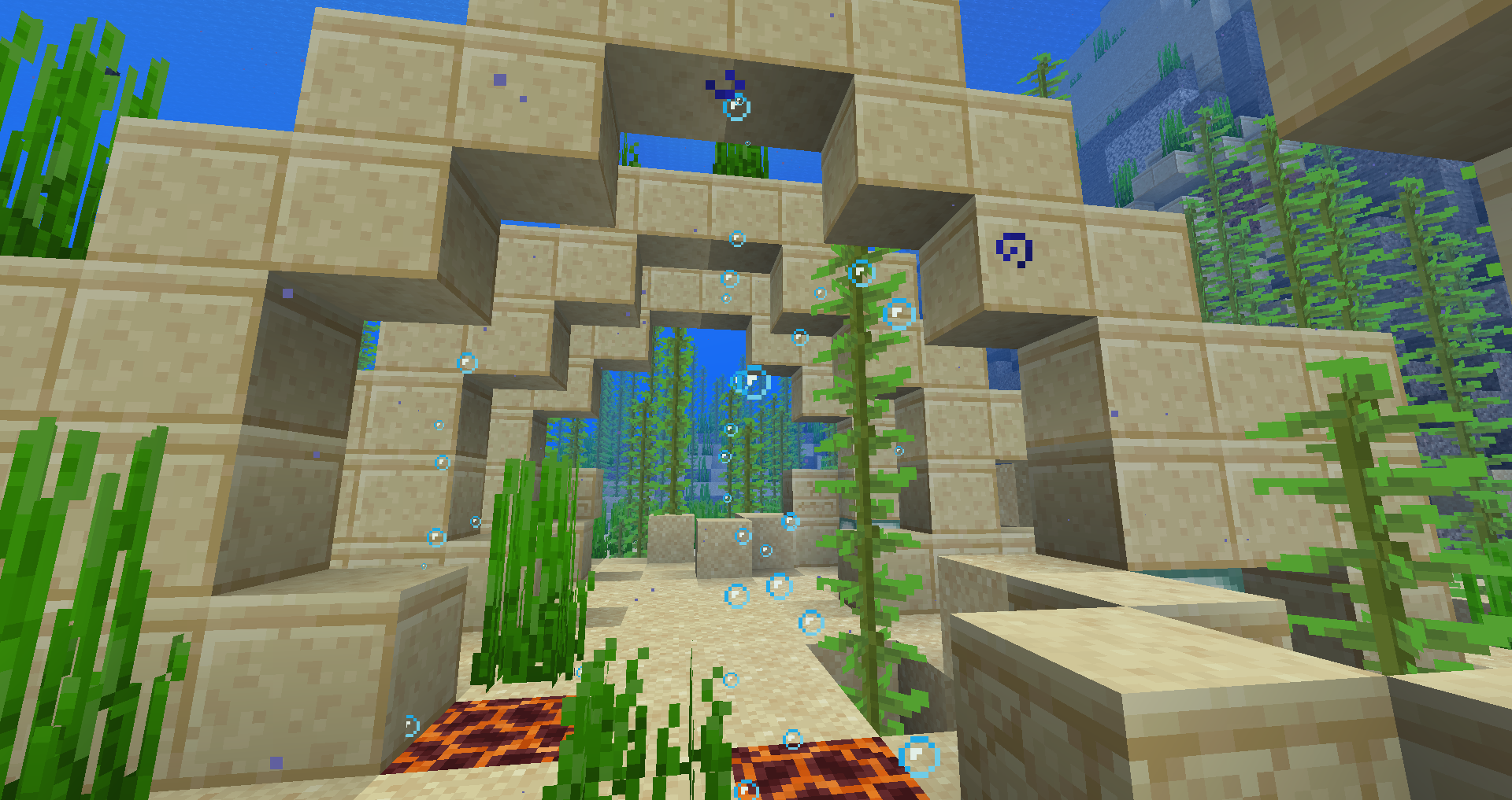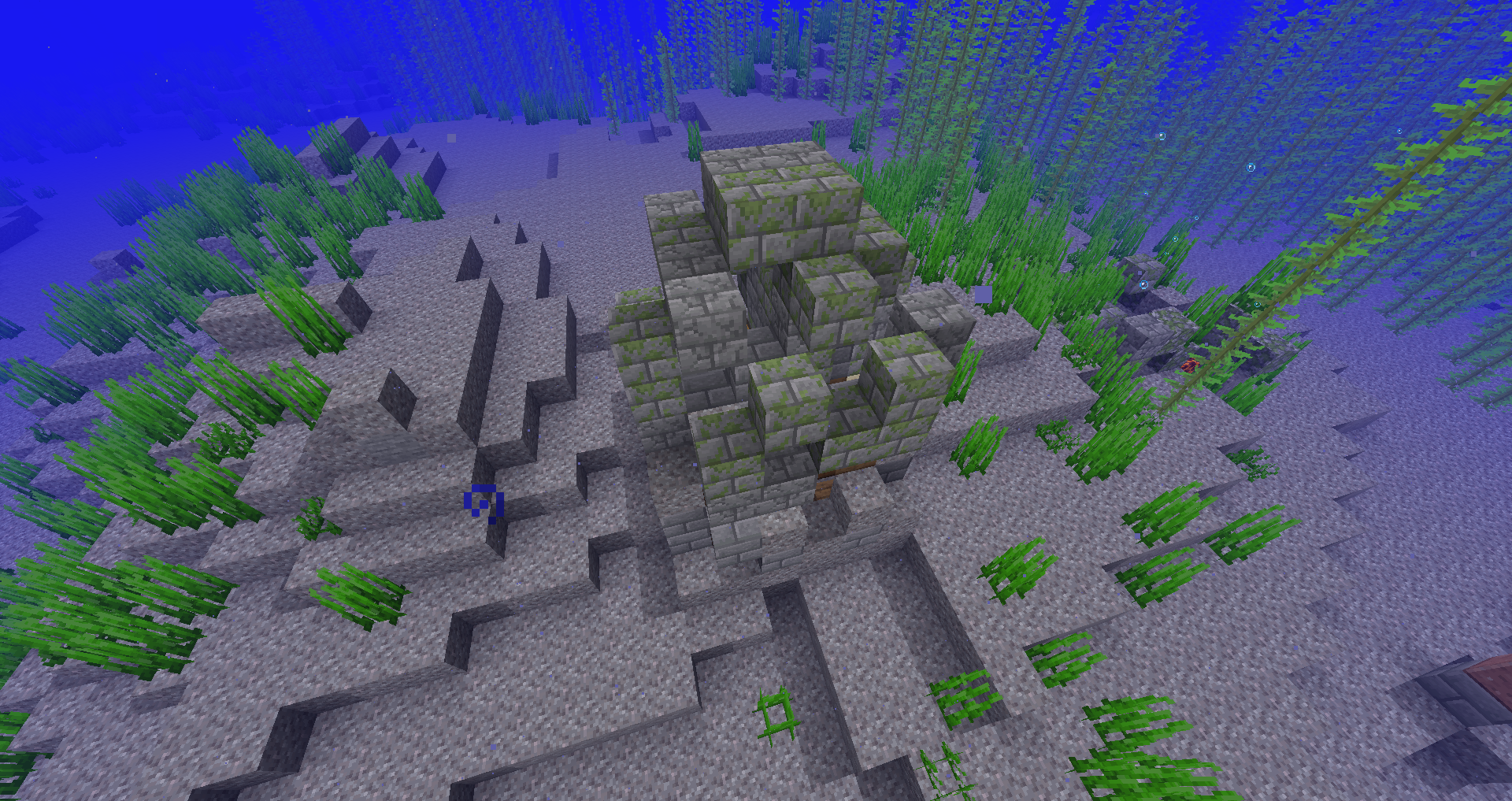 Las ruinas frías bajo el agua se componen principalmente de ladrillos de piedra y grava, y también contendrán prismarina, arena, bloques de magma, linternas de mar, granito pulido, terracota esmaltada, ladrillos, madera, roca, ladrillos de piedra musgosa, escaleras de ladrillos de piedra, obsidiana, y/o un cofre con botín. Las ruinas submarinas cálidas se componen principalmente de arena y arenisca, y también contendrán granito pulido, diorita pulida, linternas de mar Bloques de magma, grava, terracota, escaleras de arenisca, y/o un cofre de botín.