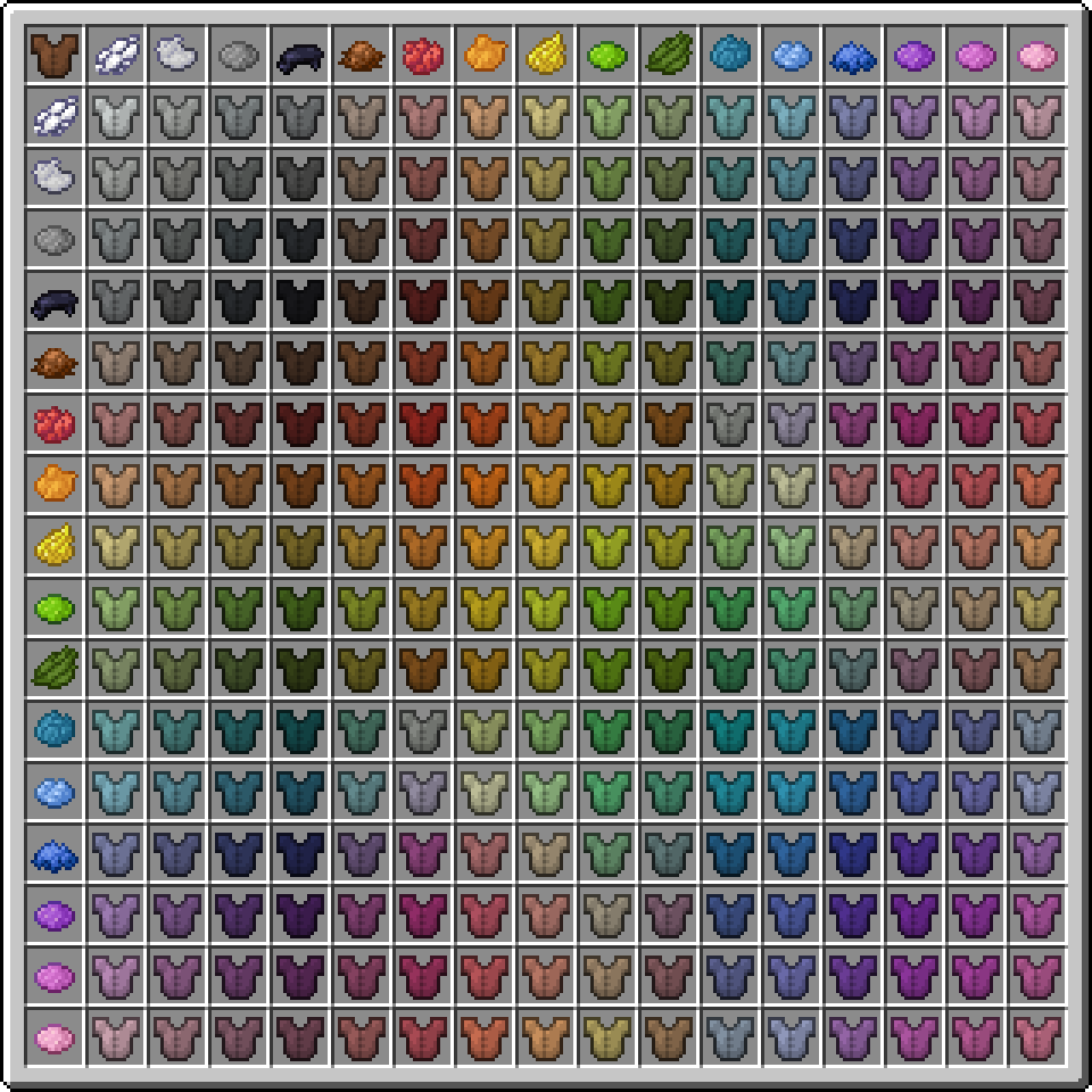 Hay 5,713,4381[1] (34.1% de sRGB) colores que la armadura de cuero puede tener, ya que es posible poner más de un tinte en el banco de trabajo junto a la armadura de cuero. La armadura se puede teñir varias veces con los colores anteriores afectando al resultado final. La armadura coloreada se puede revertir a su color original usando un caldero con agua sin teñir.