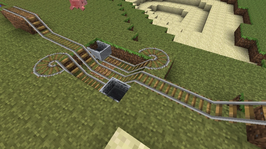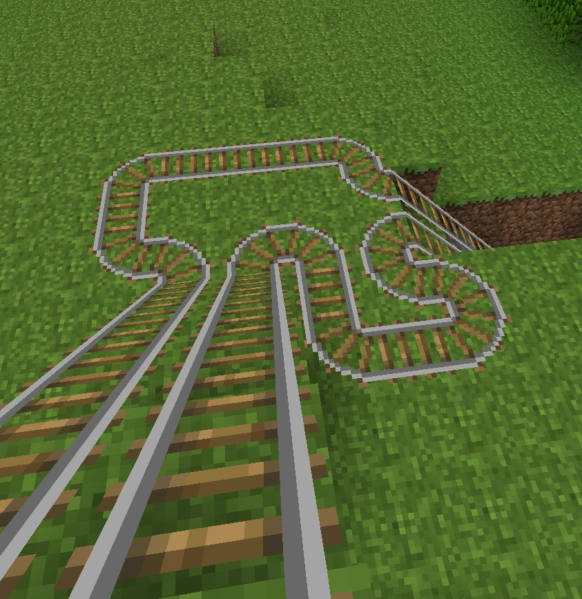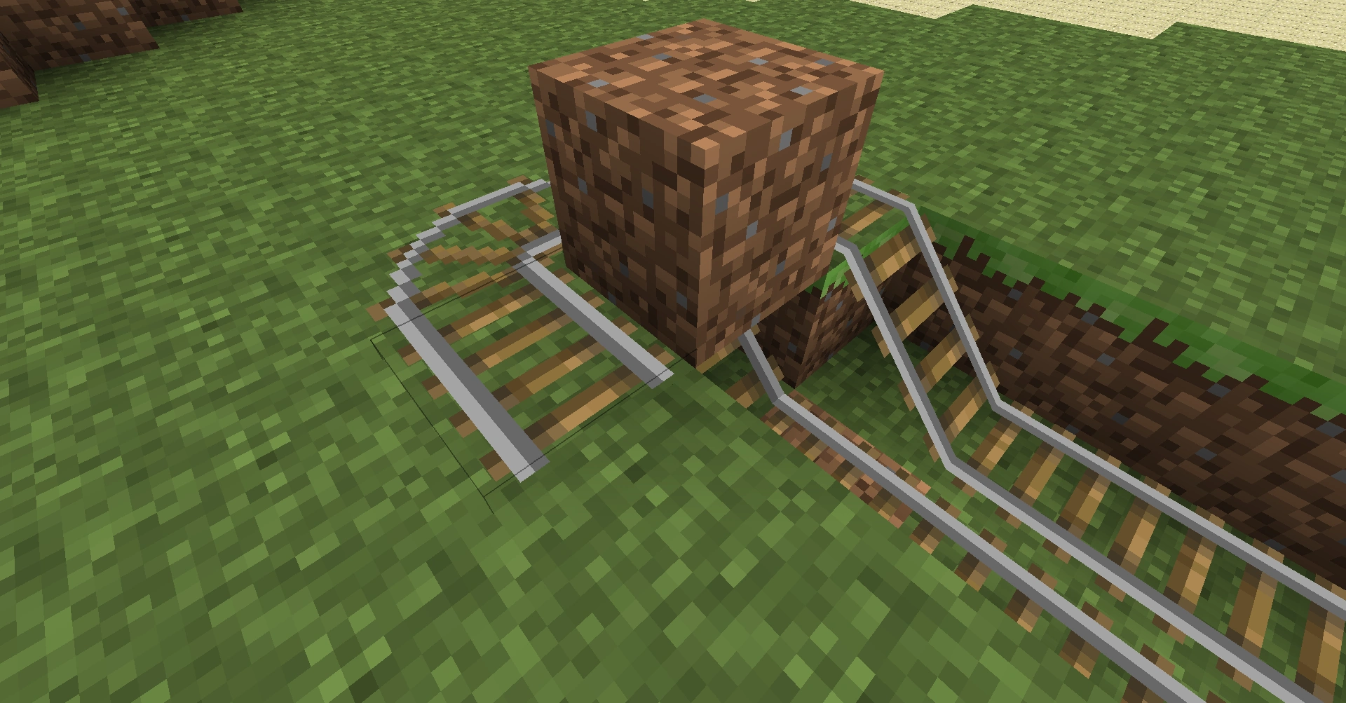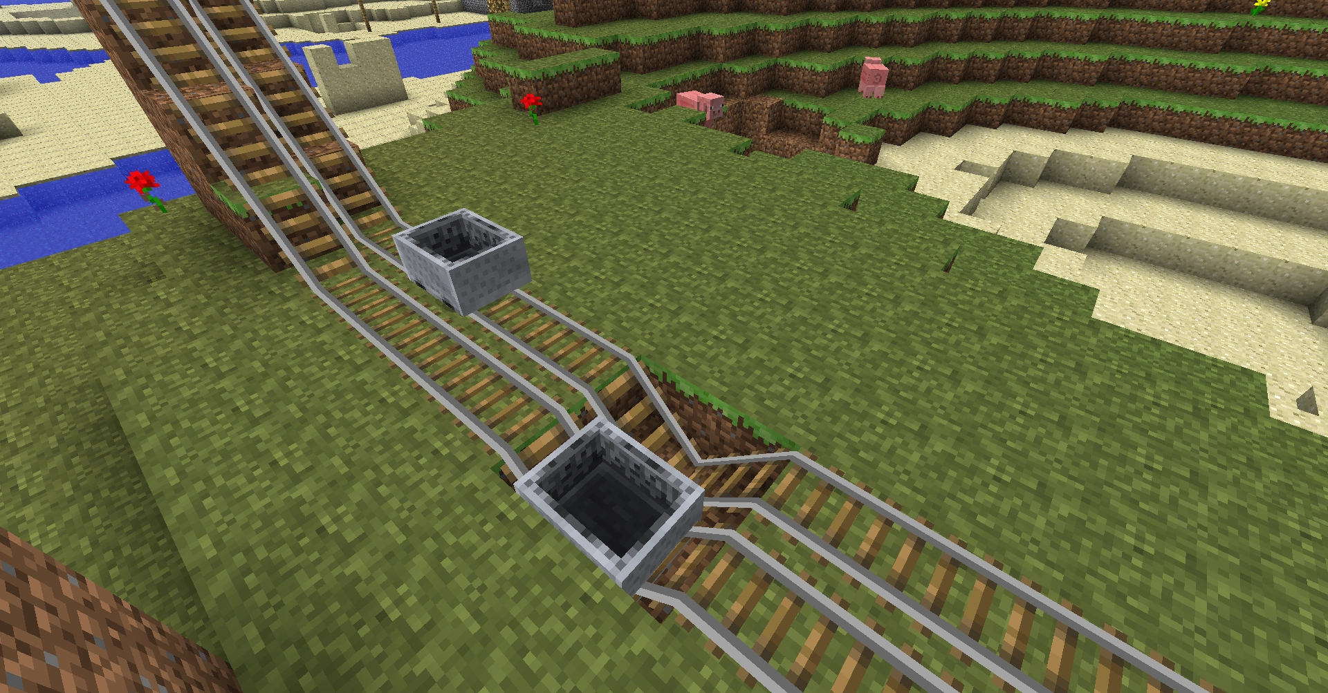 En primer lugar construye una vía como la siguiente. Para cambiar la direccion de la tercera vía es necesario colocar un bloque sobre la que está inclinada.