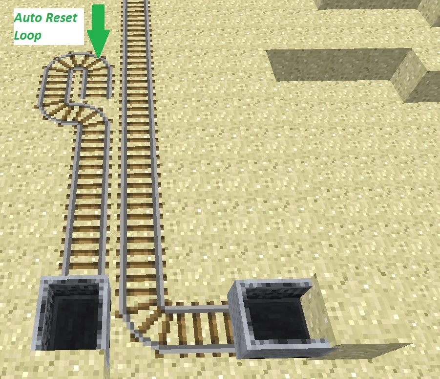 Este booster utiliza un bucle simple que impusla la vagoneta de vuelta. Debido a que la vía es un giro la vagoneta continúa en línea recta, ignorando la regla sur-oeste que se aplica cuando se trata de vías perpendicualres (sin giros).