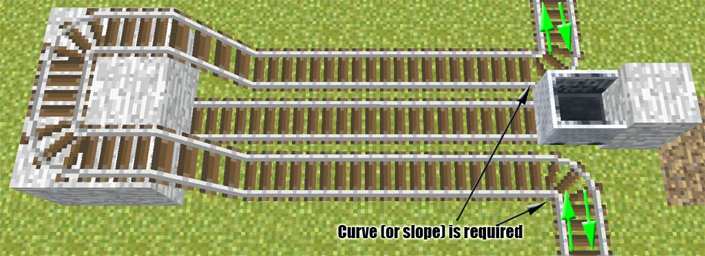 Este es un simple principio que involucra 4 vías y dos vagonetas. Coloca las vías en forma de círculo y pon una vagoneta en dicho círculo. En el otro lado coloca otra vagoneta. Después pon tu vía principal al lado. Cuando la vagoneta a impulsar toque las del círculo será acelerada. Nota: este método debe ser evitado en modo multijugador ya que crea mucho lag.