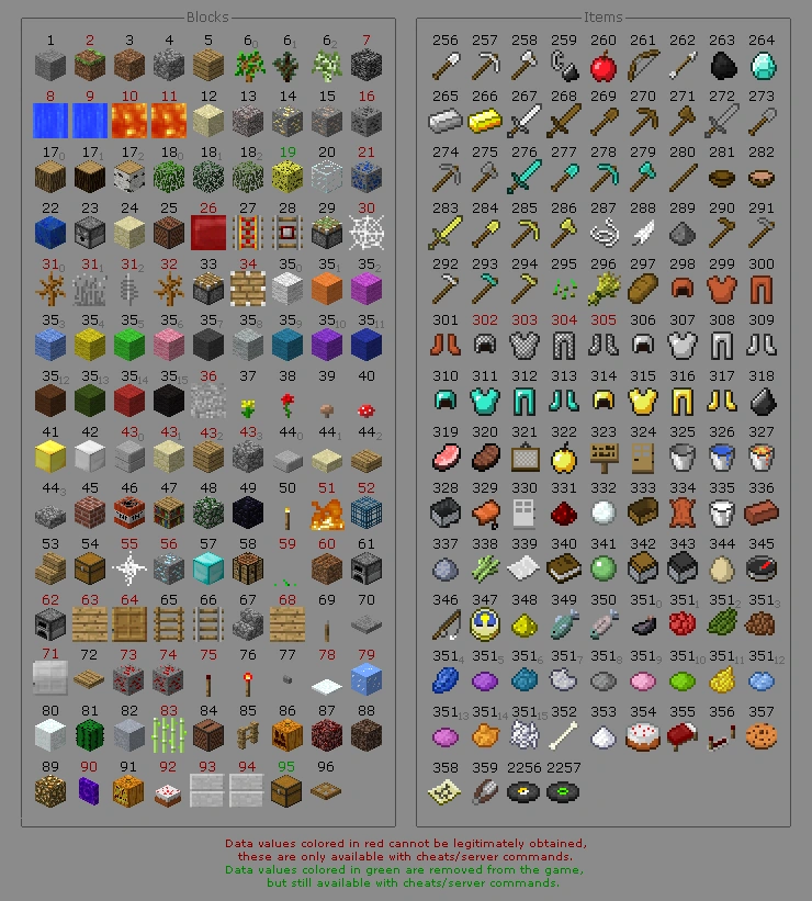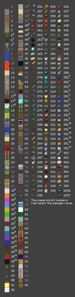 Las entradas marcadas con un D </ sup> requieren datos adicionales para definir completamente el bloque en un mundo Beta. Las entradas marcadas con un I </ sup> tienen un ID diferente como un objeto del inventario. Las entradas marcadas con B </ sup> requieren datos de inventario adicionales para definir completamente el objeto del inventario. Los artículos con los ID en red </ span> no puede ser legítimamente obtenido en el inventario del jugador en el juego; sólo pueden ser obtenidos por la "piratería" (como el uso de editores de inventario) o, en el modo multijugador con el comando / give servidor. Artículos disponibles sólo en el modo creativo están en púrpura </ span>. El aire no está disponible en el inventario y hará que su cliente se bloquee si de alguna manera llega allí.