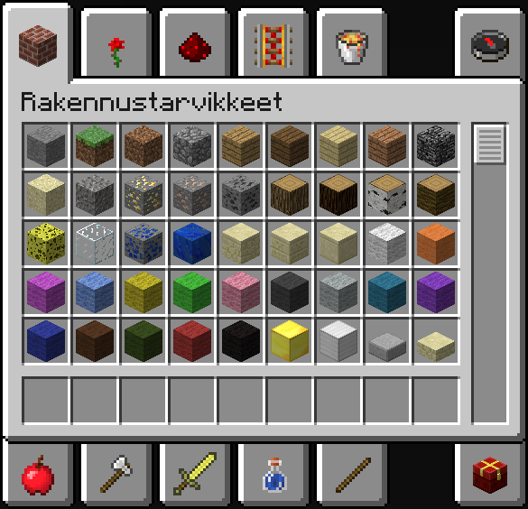 - 1.3.1-versiossa esineenvalintaruudun esineet ja kuutiot jaettiin kymmeneen eri osaan: rakennuskuutioihin, koristekuutiohin, punakivisysteemeihin, kuljetukseen, sekalaisiin, elintarvikkeisiin, työkaluihin, taisteluun, hauduttamiseen ja materiaaleihin.