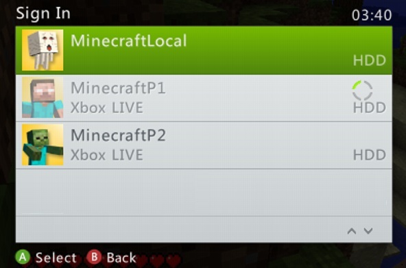 Etape 1. Le joueur sélectionne "Play Game", choisit soit de créer un nouveau monde ou de relancer un monde déjà créé et s'assure que la vidéo est bien en 720p, en utilisant un cable HDMI ou une composante RVB.