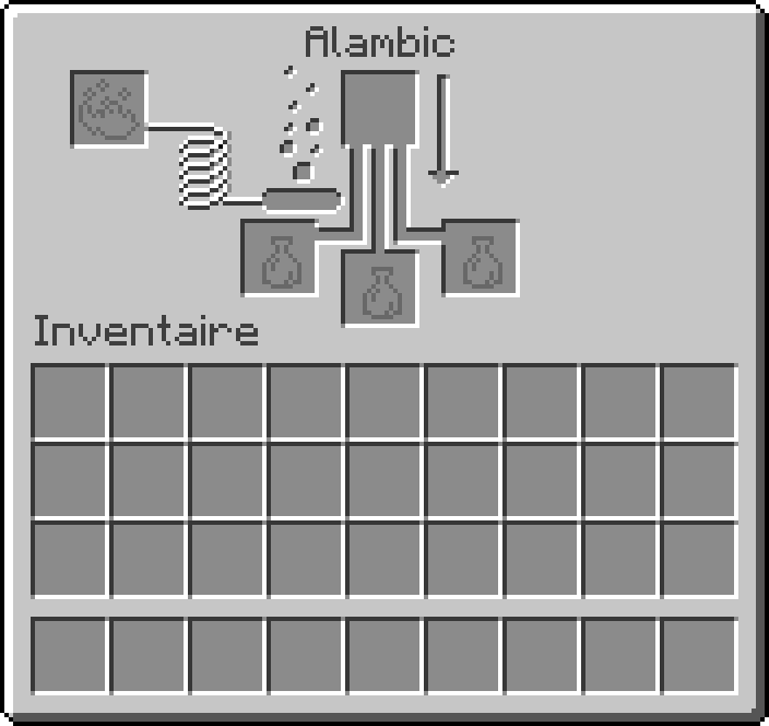Dans l'interface de l'alambic, l'emplacement du haut est prévu pour un ingrédient qui sera distillé dans les fioles placées dans les trois emplacements du bas, l'emplacement de gauche sert à placer la poudre de Blaze qui est le carburant des réactions (une poudre de Blaze permet 20 réactions). S'il reste du carburant (modélisé par la barre rouge sous les bulles) le processus d'alchimie peut démarrer lorsque l'emplacement du haut et au moins un emplacement du bas sont occupés par des éléments compatibles, les bulles à gauche s'animant alors. L'avancement du processus est indiqué par la flèche à droite. Lorsque celle-ci est pleine, le processus se termine, l'ingrédient disparaît et le contenu des potions évolue. Si au cours de l'opération, l'ingrédient ou l'ensemble des fioles sont retirés, le processus est interrompu.