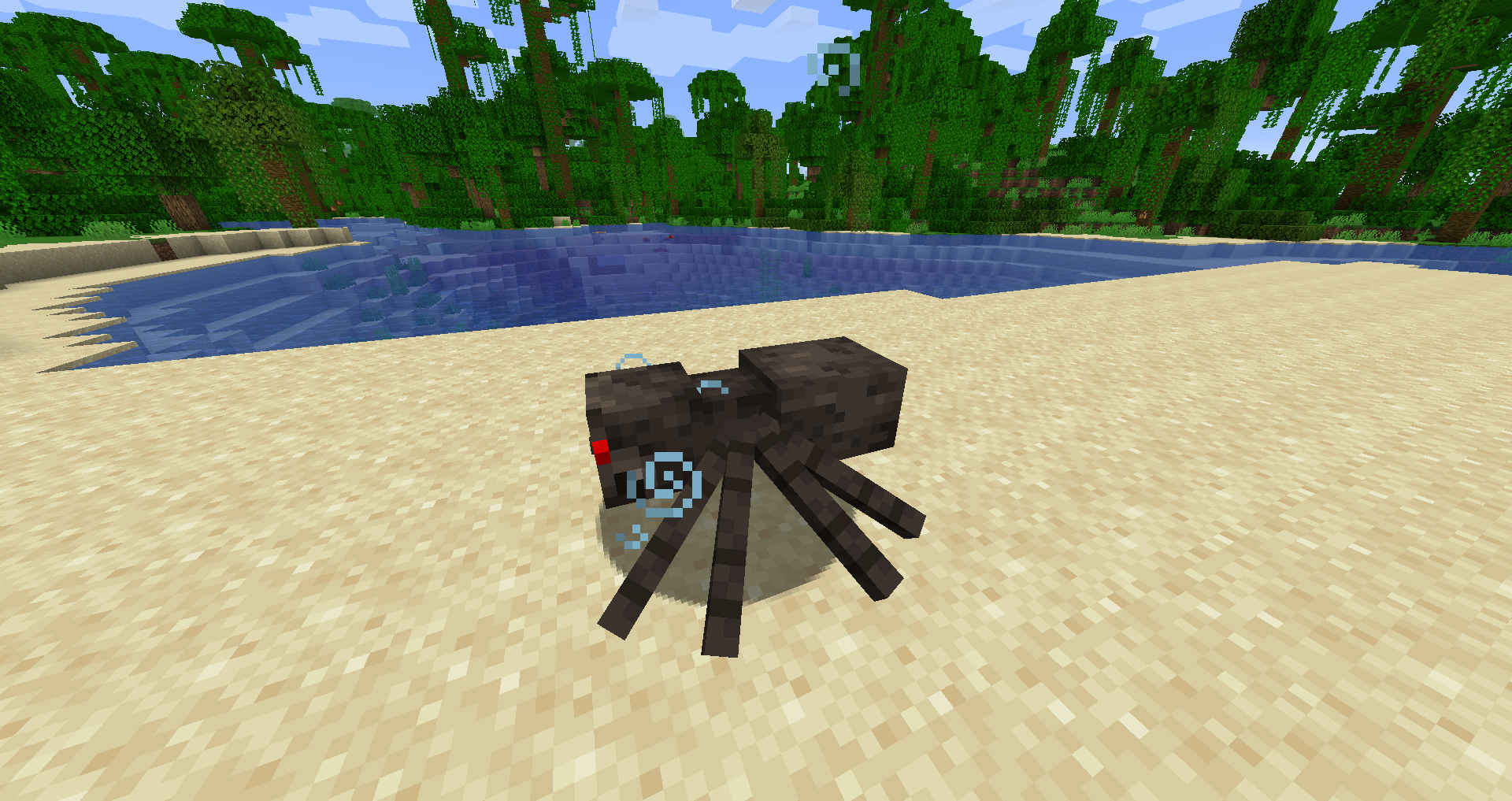 - Si l'eau dans laquelle une araignée nage n'est qu'à 1 bloc de profondeur, elle peut attaquer les ennemis proches en touchant le sol submergé.
