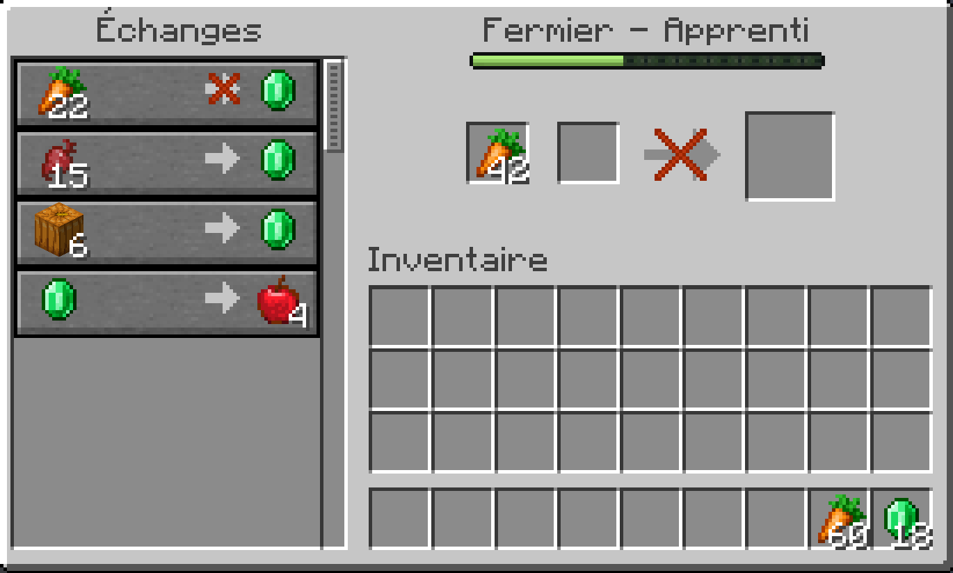 | Niveau | Type de commerce | Objet(s) voulu(s) | Quantité par défaut | Multiplicateur de prix | Objet proposé | Quantité | Échanges jusqu'à épuisement | XP pour le villageois |