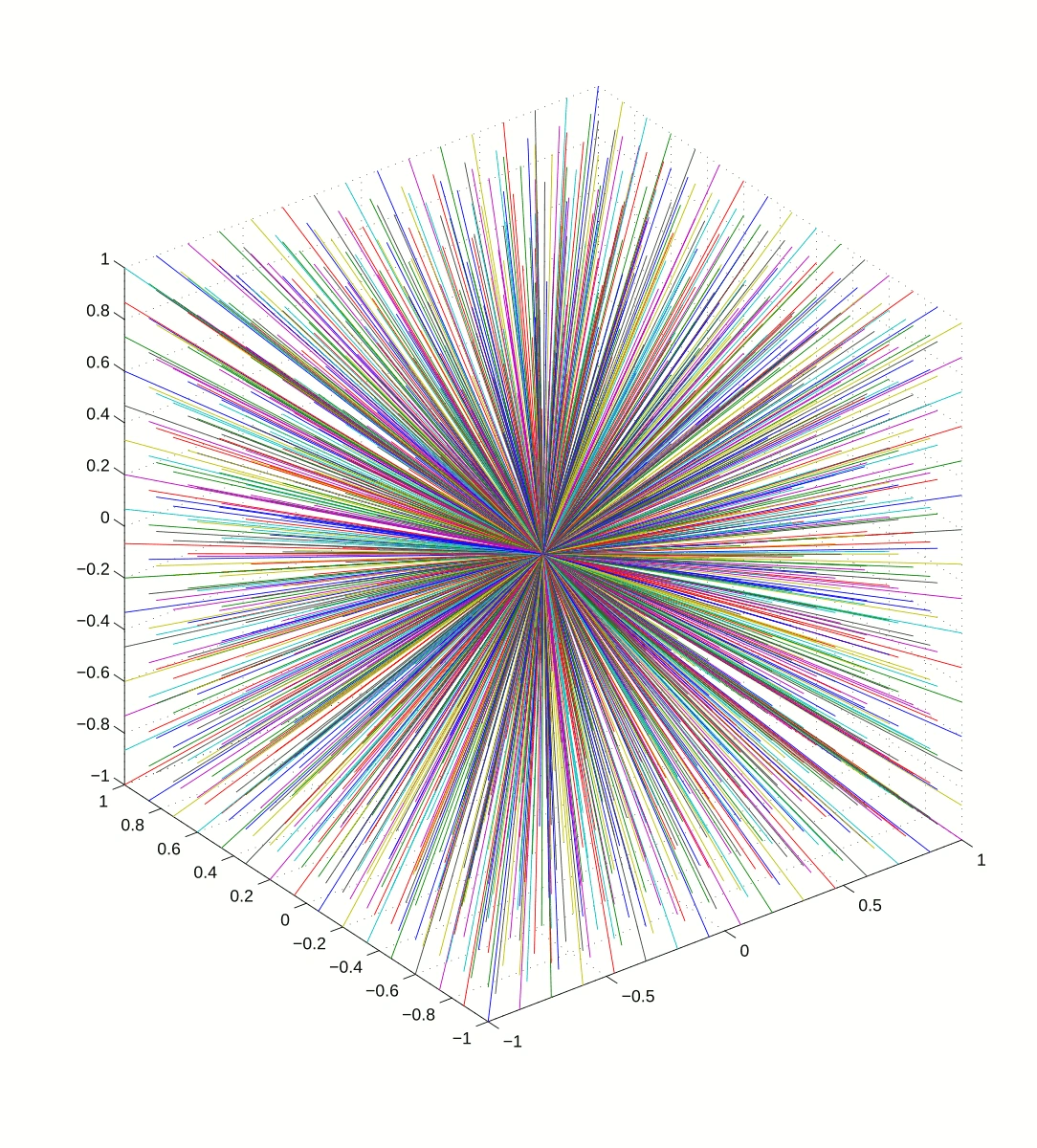Rayons d'une explosion disposés uniformément sur la surface d'un cube de longueur 2 (ne définit pas le longueur des rayons, seulement leur direction).