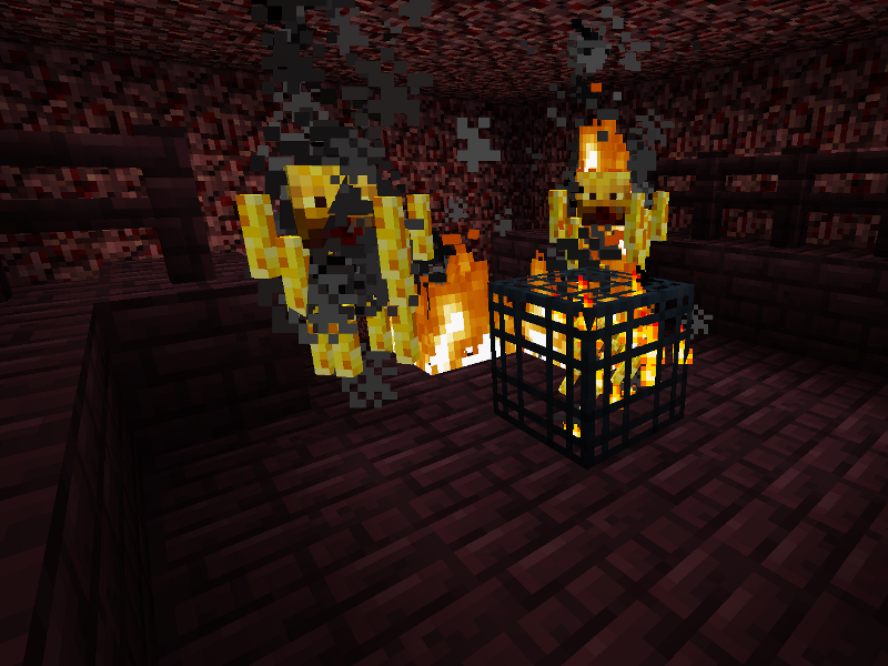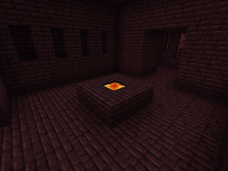 | Salle du générateur de Blazes | Cette pièce (parfois à "ciel ouvert") dispose en son centre d'un générateur de Blazes. Ce dernier est le plus souvent entouré d'un muret d'un bloc de haut en briques du Nether surplombé de barrières en briques du Nether elles aussi. Il est possible de trouver plusieurs salles de ce type dans une même forteresse |