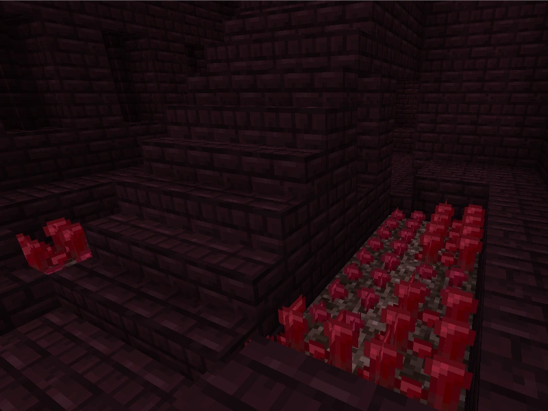 | Salle des verrues du Nether | Deux plantations de verrues du Nether (2*6 cases chacune) sur du sable des âmes, sont présentes de chaque coté d'un escalier |