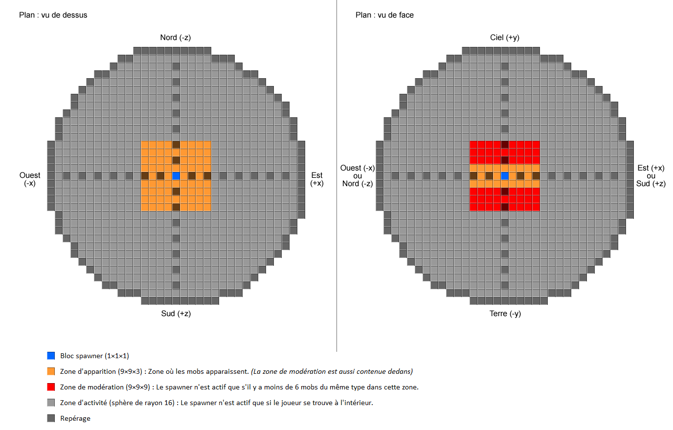 Note : les monstres ayant un volume supérieur à 1 bloc (ex: zombie 1x2x1, araignée 2x1x2), pourront dépasser de cette zone à leur apparition, tant que leur base (point de référence) est incluse dans la zone. - Zone de modération : Elle englobe la zone d'apparition. Les monstres du type généré, présents dans cette zone, seront pris en compte dans le processus de génération. Si le nombre en présence atteint la limite, aucun monstre ne sera généré. En forme de parallélépipède rectangle 17x9x17, 9 blocs de haut (3 au-dessus et 3 en-dessous du générateur), base carrée 17x17 centrée sur le bloc générateur (soit 8 blocs de distance de chaque côté autour du générateur, sans considération de l'orientation)