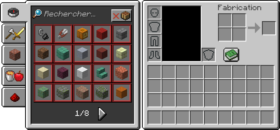 L’inventaire possède également un emplacement réservé au livre de recettes, qui sert de catalogue de recettes et de guide pour l’artisanat. Il s’affiche avec une grille de 2×2 (inventaire) ou 3×3 (établi). Il suffit de cliquer sur le bouton représentant un livre des connaissances ; le livre de recettes s’affiche alors sur la gauche.
