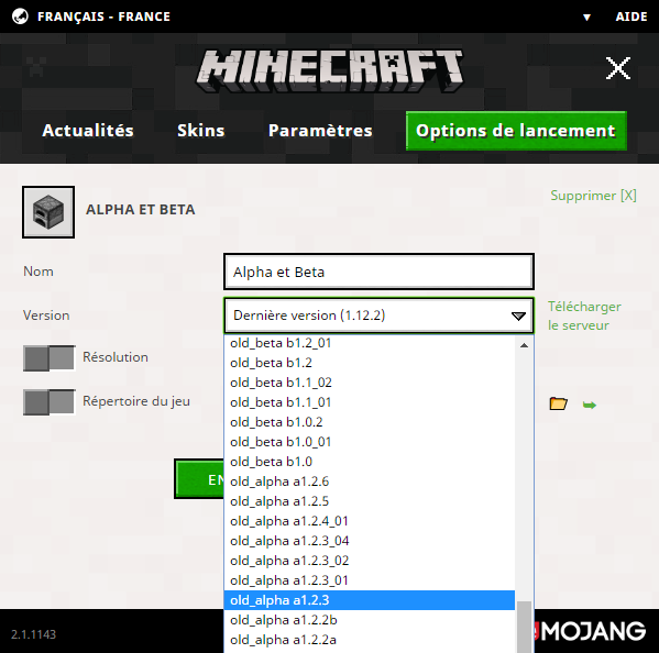 La version officielle la plus récente est la 1.20.2 . Pour activer les anciennes versions, il faut soit cliquer sur le bouton "Modifier le profil" ou, de préférence, créer un nouveau profil. Dans le menu déroulant "Sélection de la version" il faut choisir d'autoriser l'utilisation d'Alpha et/ou de versions bêta en cochant les cases appropriées. Ensuite, sélectionnez la version souhaitée dans le menu déroulant et enregistrer le profil.