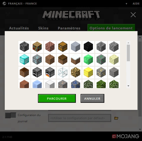 Menu de sélection de l'icône du profil. On peut y voir des blocs de Minecraft correspondant aux icônes disponibles par défaut.