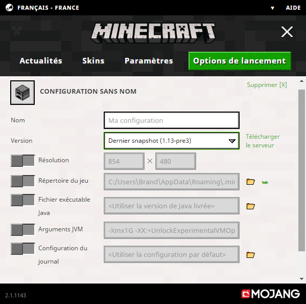 Lorsque vous ouvrez le launcher pour la première fois, il crée un profil qui sélectionne la dernière version de Minecraft. Celui-ci ne peut pas être supprimé.