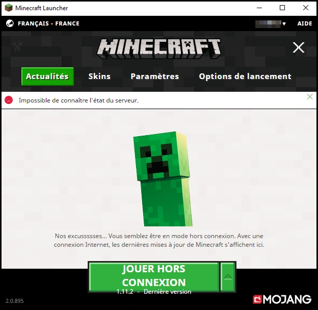 L'écran qui s'affiche quand le launcher n'arrive pas à se connecter aux serveurs de Mojang.