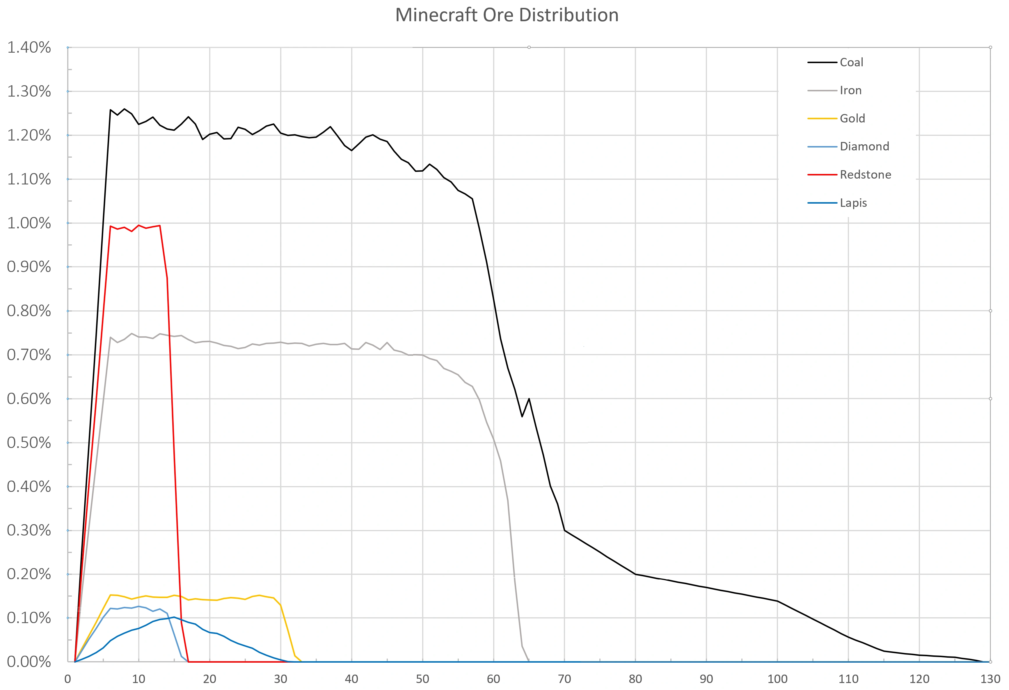 Le minerai de redstone est situé aux mêmes couches et réparti statistiquement de la même manière que le minerai de diamant, mais est généré en quantité huit fois plus importante par tronçon.