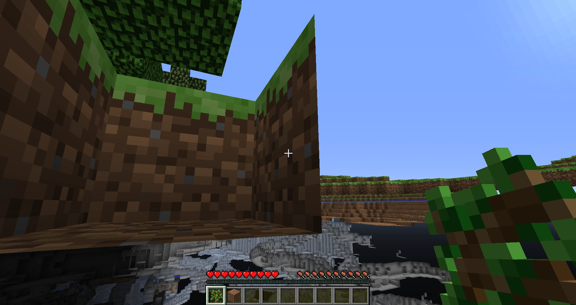 - Composition moyenne du « coin » des terres lointaines : 40% roche, 16% air, 28% eau, 10% terre/herbe, 2% bedrock, et 4% autres (repose sur une section de 14x14 cubes).