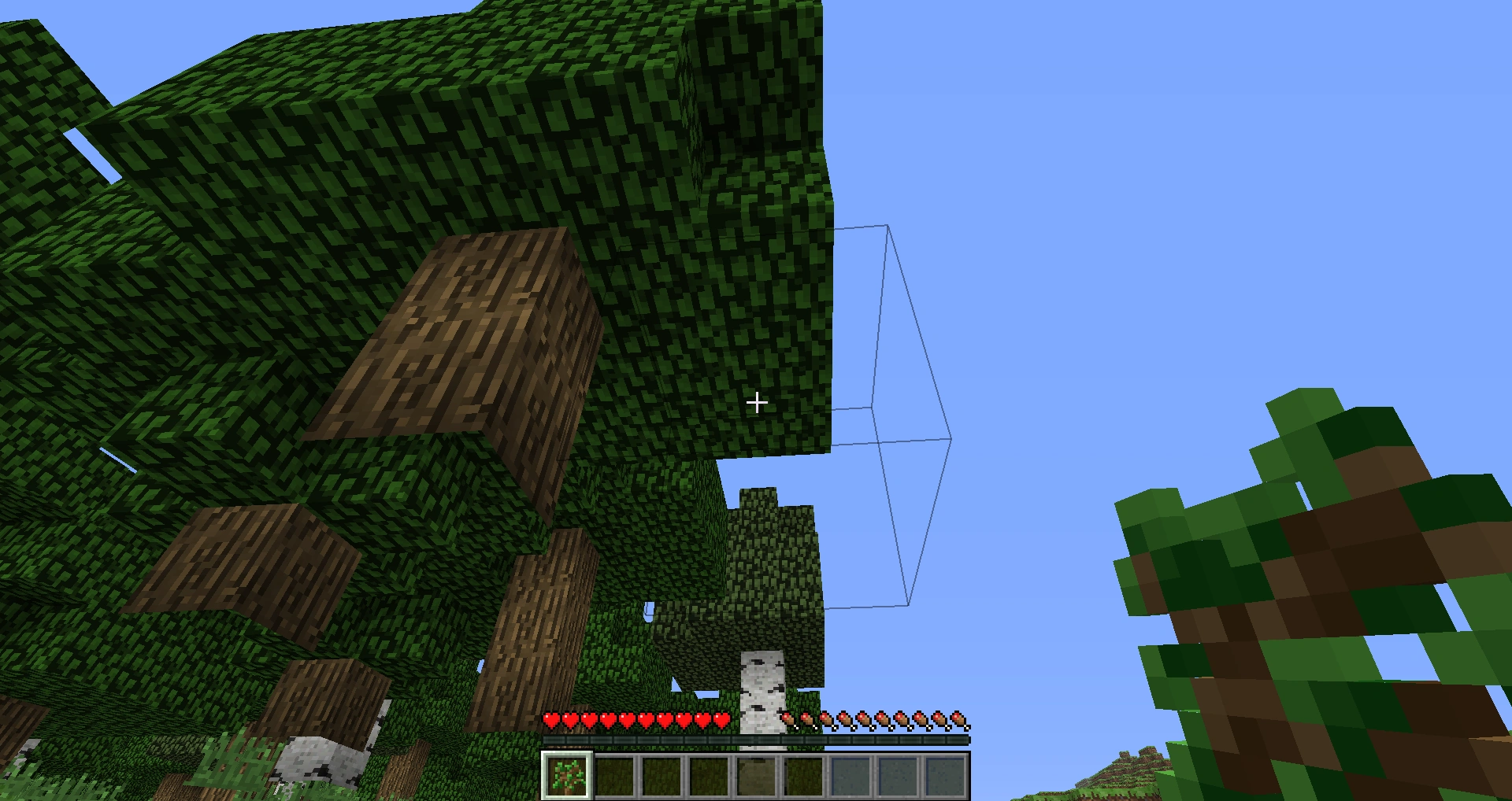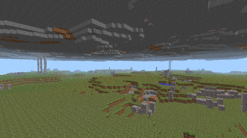 - Composition moyenne du « bord » des terres lointaines : 36% roche, 25% air, 23% eau, 10% terre/herbe, 2% bedrock, et 4% autres (repose sur une section de 14x14 cubes).