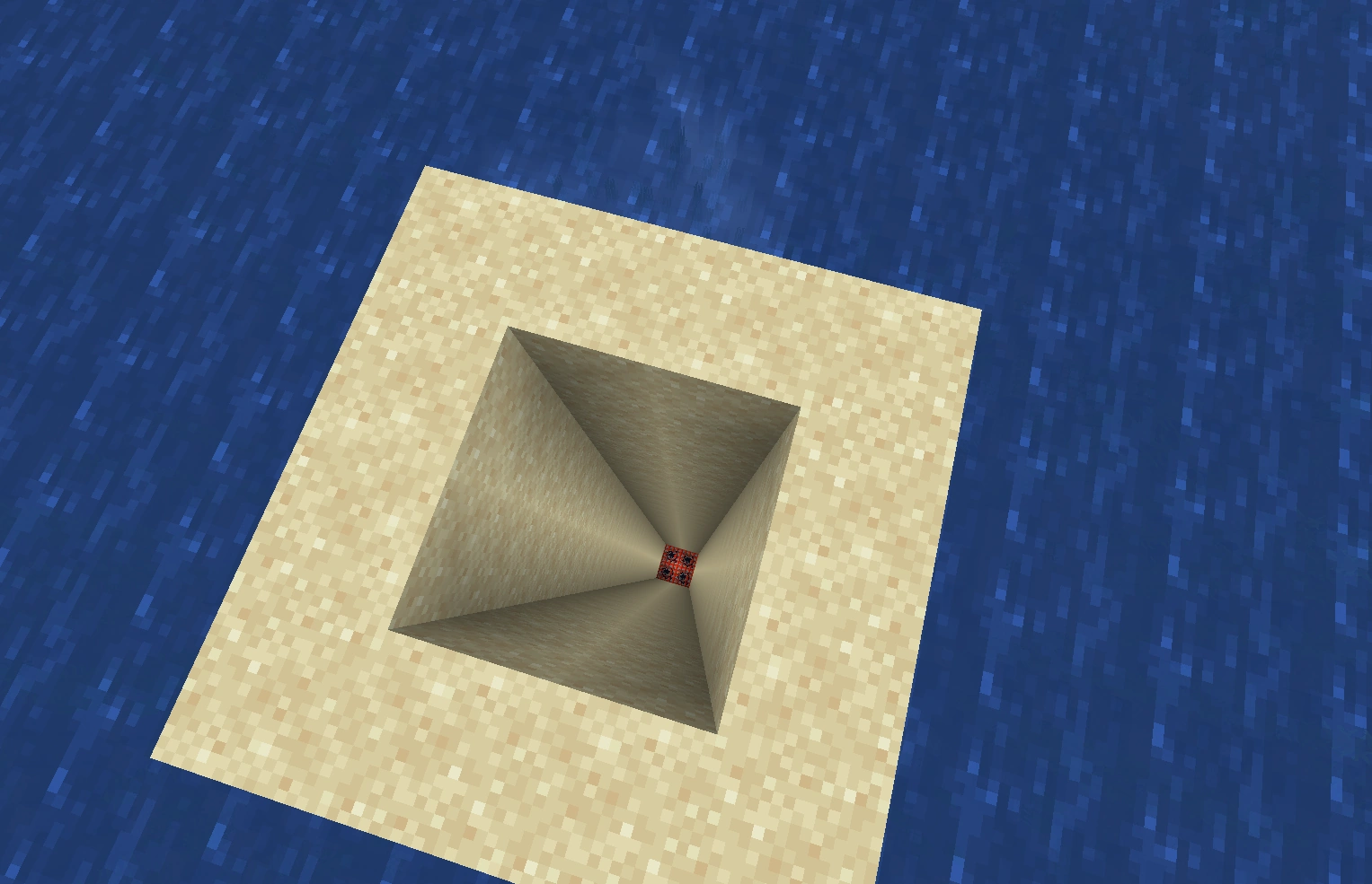 Another kind of pit is the piston pit. In this pit trap a sand structure is build on an activated piston. The structure itself uses torches to keep the sand at the top. The structure is build like an upside down pyramid so that one sand block is holding the others. When the piston is toggled, the main sand block above the piston will fall triggering a cascade in the rest.