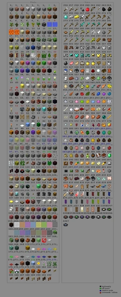 Les valeurs permettent de référencer les différents types de blocs et d'objets. Elles sont utilisées pour beaucoup, beaucoup de choses dans Minecraft. Les ID des blocs sont utilisés pour définir les blocs placés dans le monde et ceux récoltés (incluant ceux dans les coffres, inventaires, et ceux laissés dans la nature). Les ID des objets sont seulement valides pour les objets. Chaque case de l'inventaire a un unique numéro de case. Dans un monde, les données de blocs définissent comment ils sont placés, décrivant par exemple la hauteur de l'eau ou la direction d'une torche.